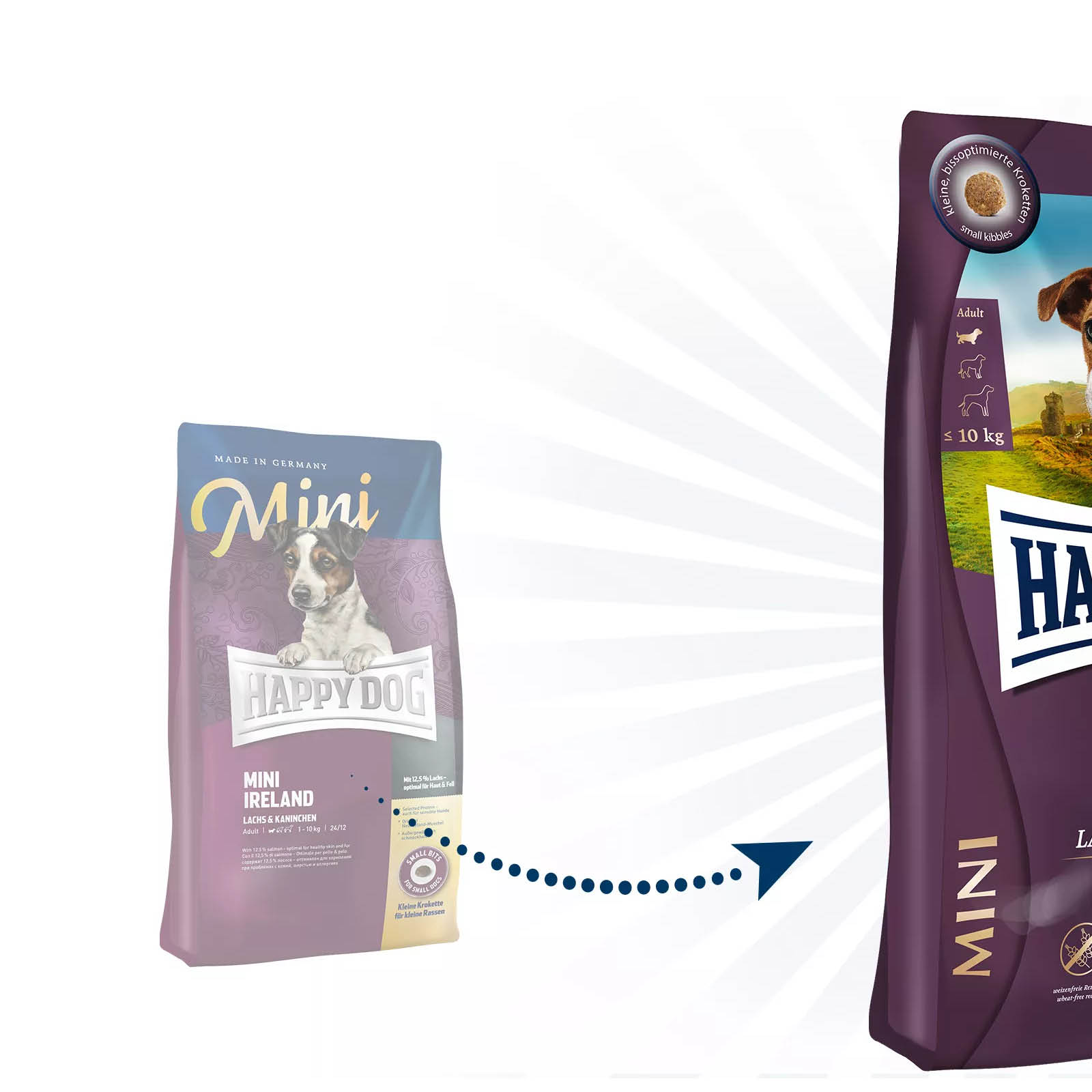 Küçük gurme köpeÄŸinizi besleyici somon balığı, lezzetli tavÅŸan ve saÄŸlıklı tahıldan oluÅŸan güzel bir yemekle şımartın. Somon, temel Omega-3 ve Omega-6 yaÄŸ asitleri bakımından zengindir, tavÅŸan ise deÄŸerli protein ve diÄŸer önemli besinleri saÄŸlar. Tam tahıllar, köpeÄŸinize sindirimi düzenlemeye yardımcı olmak için hayati lif ve kaba yem saÄŸlar. EÅŸsiz Happy Dog Natural Life Concept®'e dayanan Yeni Zelanda midyeleri eklemleri desteklerken, deÄŸerli Omega-3 ve Omega-6 yaÄŸ asitleri saÄŸlıklı bir cilt ve parlak bir tüy saÄŸlar. Özellikle lezzetli Happy Dog Mini Ireland formülasyonu, onu 10 kg'a kadar yetiÅŸkin dört ayaklı arkadaÅŸlar için ideal kılar. Ekstra küçük mama taneleri özellikle küçük ırkların diÅŸleri için uygundur.