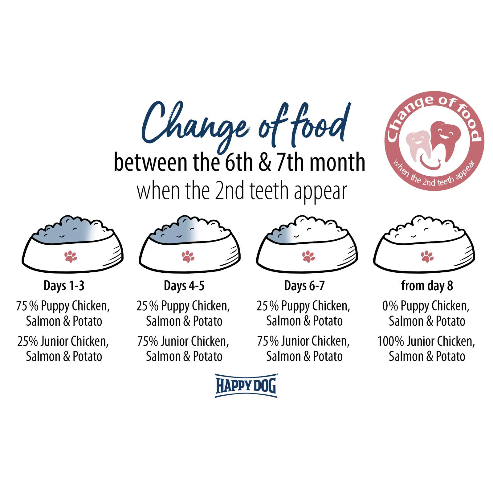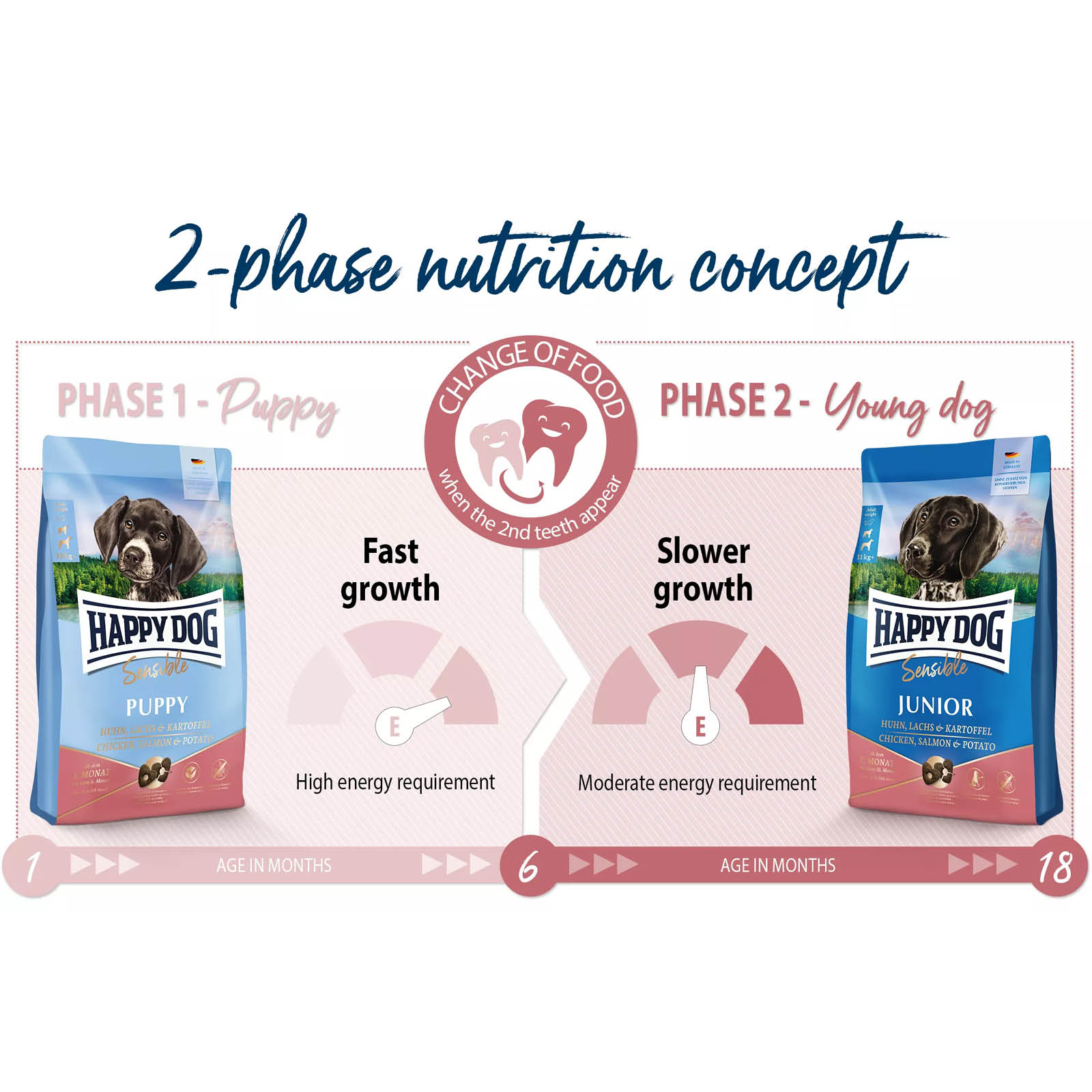 Happy Dog Sensible Puppy Tavuk, Somon ve Patates, ayın 4'ünden 27'sine kadar eksiksiz bir yiyecek olarak mevcuttur. Yavru köpeğinizin yaşam haftası uygundur. O zaman köpeğinizi küçük adımlarla genç köpekler için uygun bir mamayla değiştirmelisiniz - örneğin, Happy Dog Sensitive Junior Chicken, Salmon & Potato .